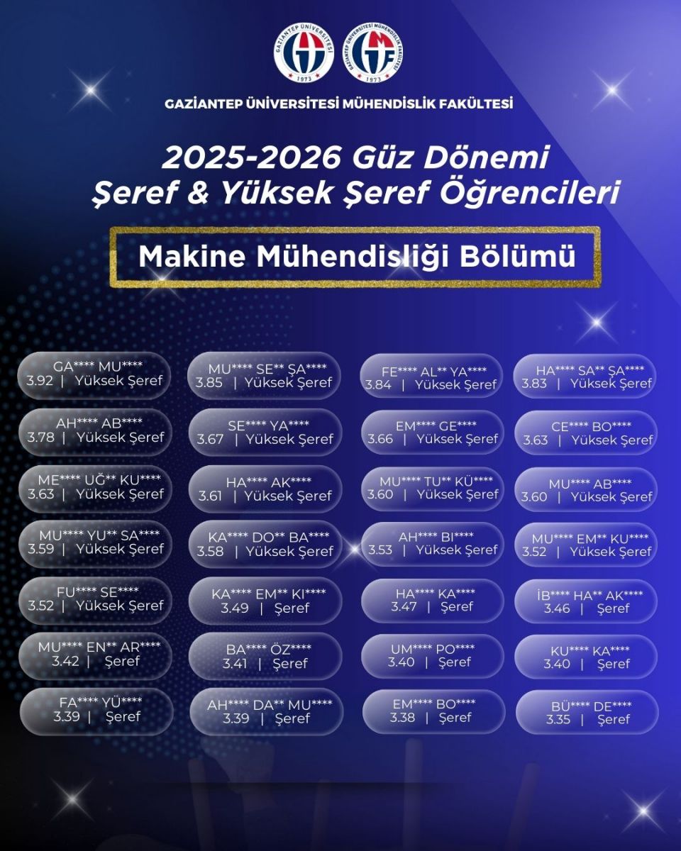 • Makine Mühendisliği Bölümü 2025-2026 Güz Dönemi Şeref&Yüksek Şeref Öğrencileri